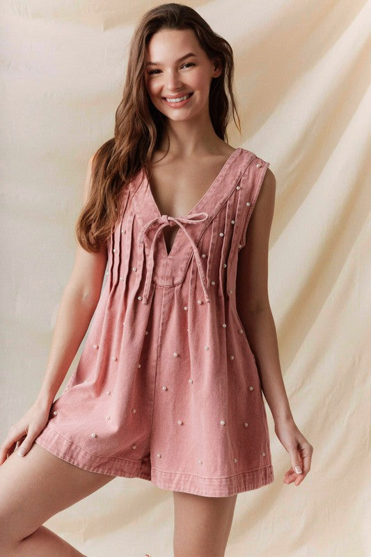 Cutest dusty rose romper! Pearls, pleats, and mineral washed denim!
